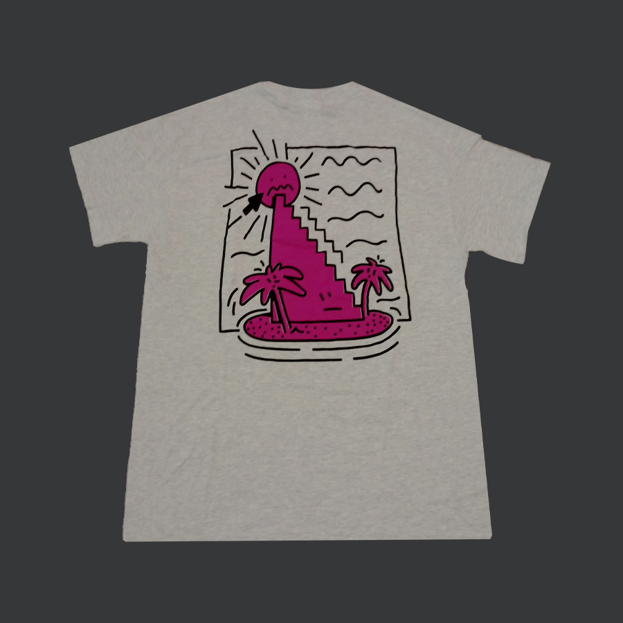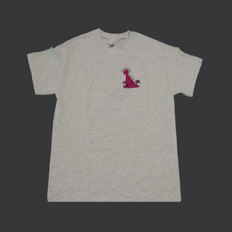 The t-shirt with the revised Stranded FM logo delivers a more playful and fun attitude then the earlier logo editions of their merchandise. Illustration by Stefan Starke. Screenprinted at Kapitaal. Light heather grey with black and magenta print. The t-shirt is made from 180 g/m2 organic cotton and produced in Mexico